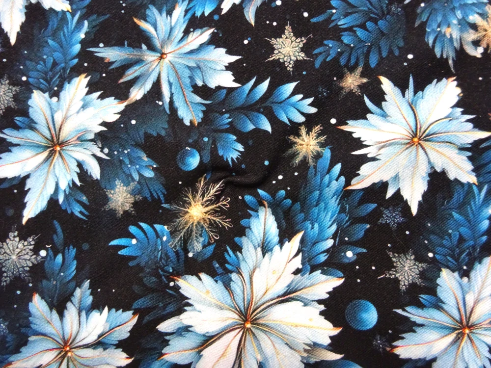 Teplákovina čierna "modré kvety, listy" - digitálna tlačSkladom18,00 EUR/ m14,63 EUR bez DPH