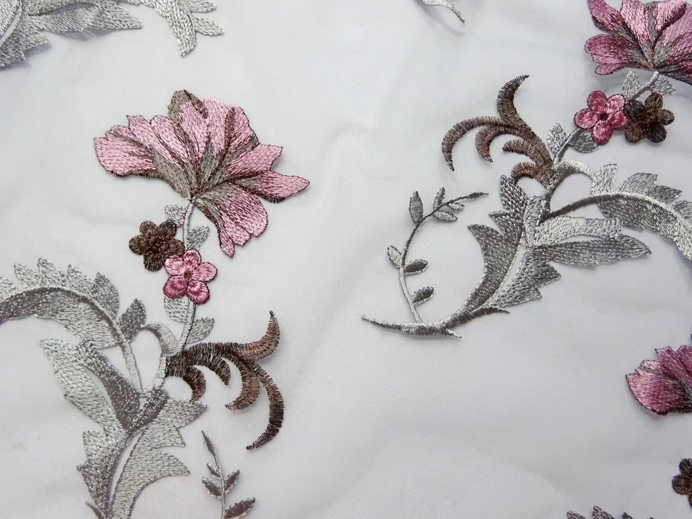 Vyšívaný tyl sivý "ružovo-hnedo-sivé kvety"Skladom32,00 EUR/ m26,02 EUR bez DPH