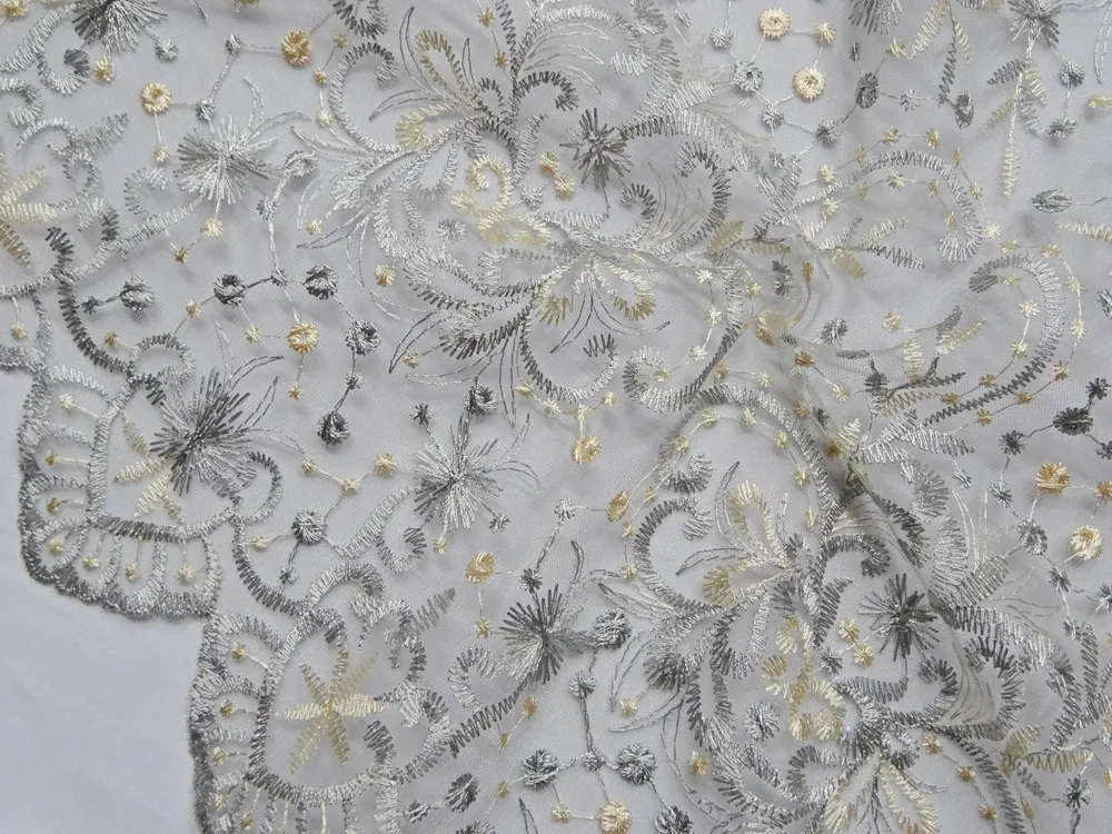 Vyšívaný tyl sivý "sivý a pomarančový vzor"Skladom28,00 EUR/ m22,76 EUR bez DPH