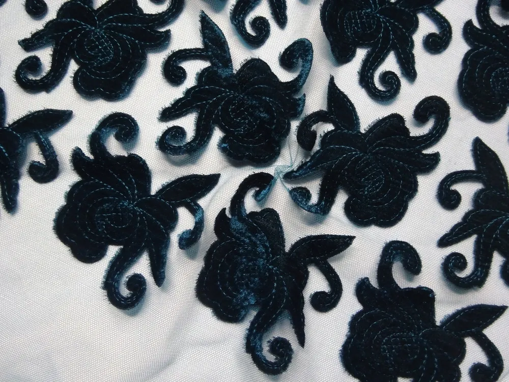 - Vyšívaný tyl smaragdovomodrý "zamatový kvet"